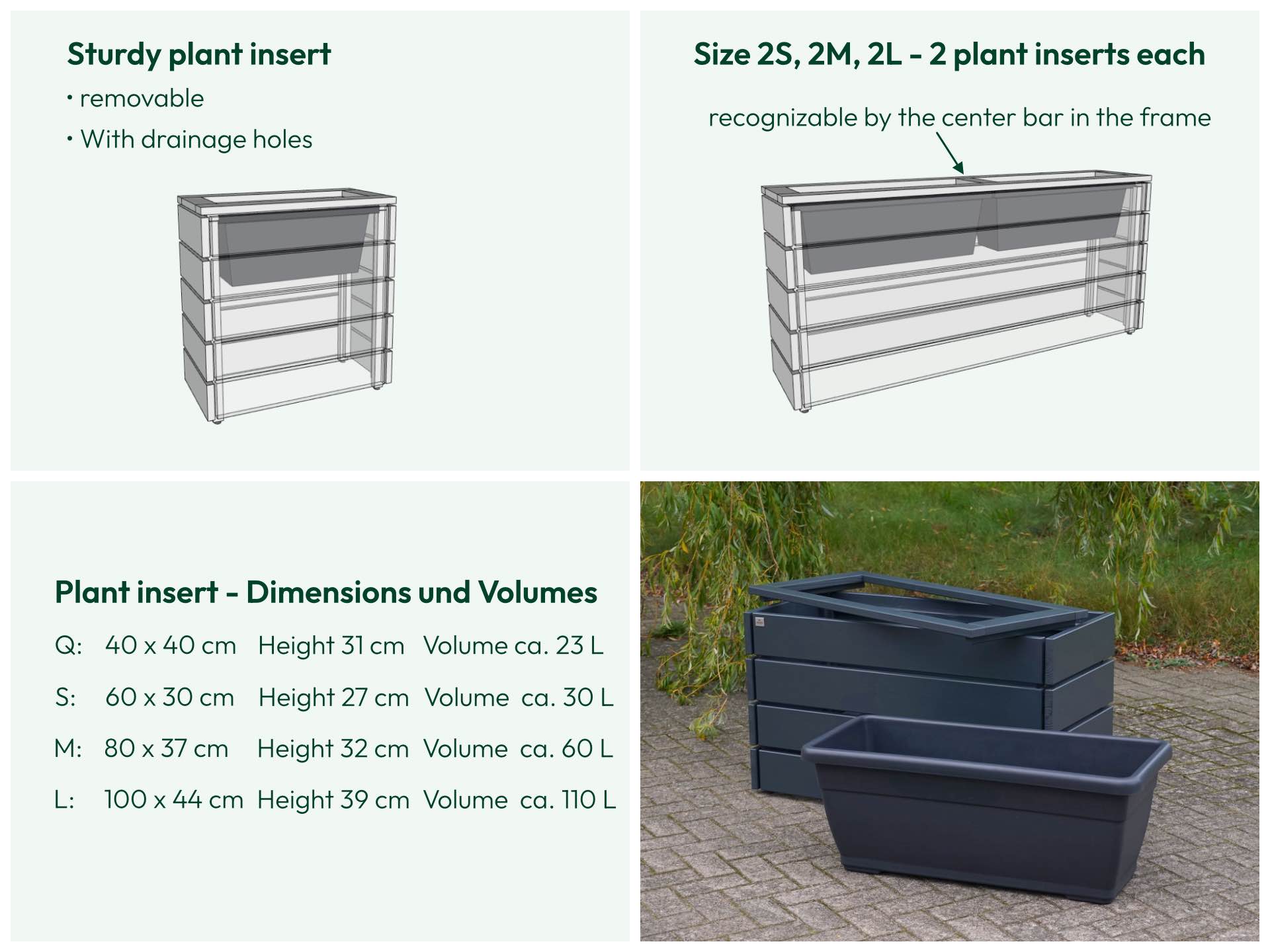 Wir liefern unseren Pflanzkasten inklusive stabilem Kunststoff - Pflanzeinsatz mit unterseitigen Öffnungen zur Vermeidung von Staunässe. Der Pflanzeinsatz wird einfach eingehängt und kann getrennt vom Pflanzkasten bequem bepflanzt werden. Der mitgelieferte Aufsatzrahmen verdeckt den Einsatz und sorgt für eine stimmige Optik
